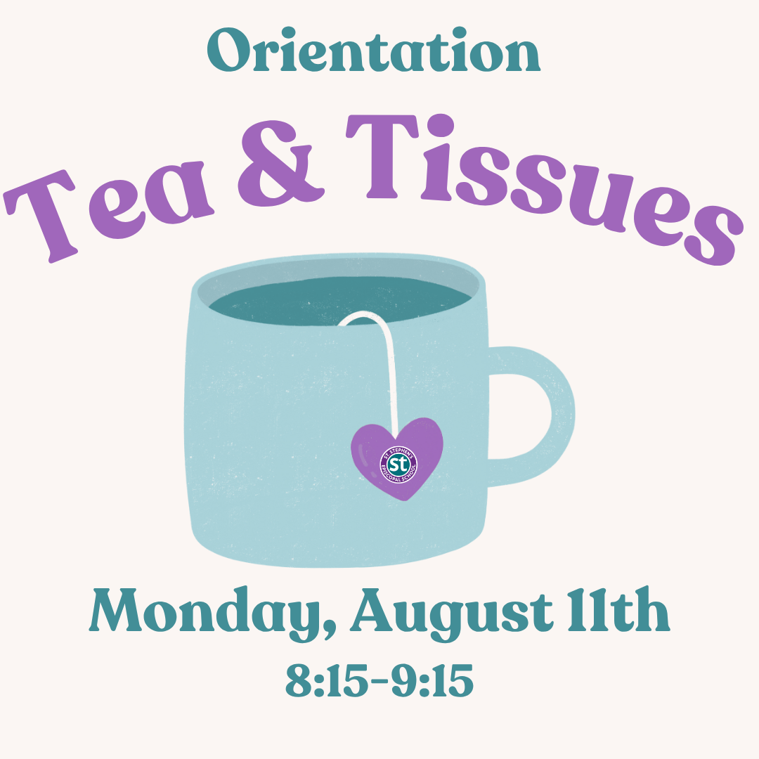 Orientation families are invited to join us for Tea & Tissues on Monday, August 11th from 8:15–9:15 AM in the Havens Center.
