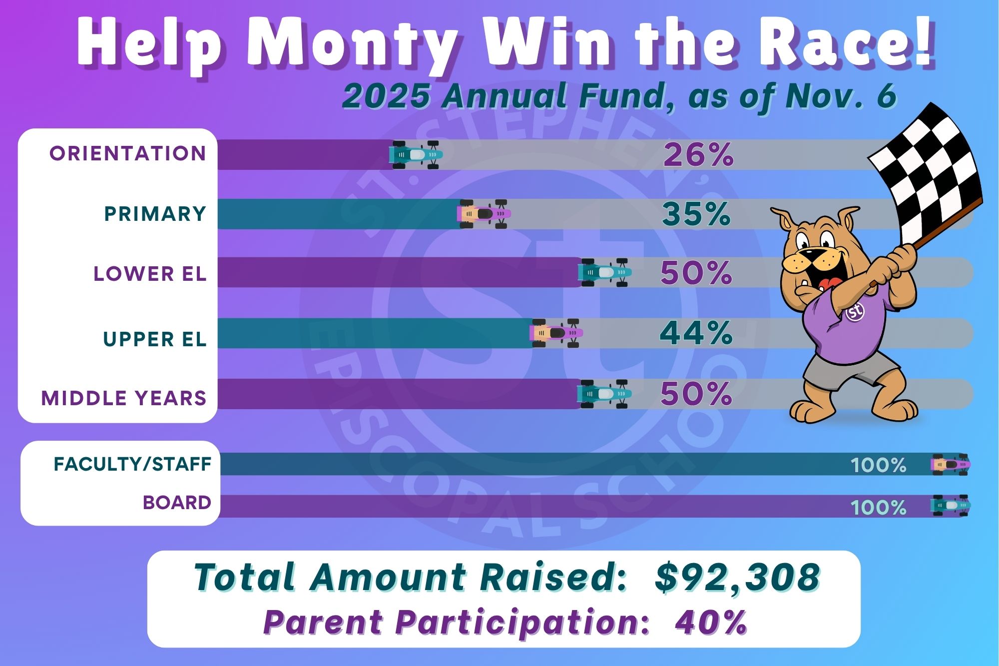 We’re picking up speed! The competition is heating up as each level races toward 100% family participation—and the finish line is getting closer every day.